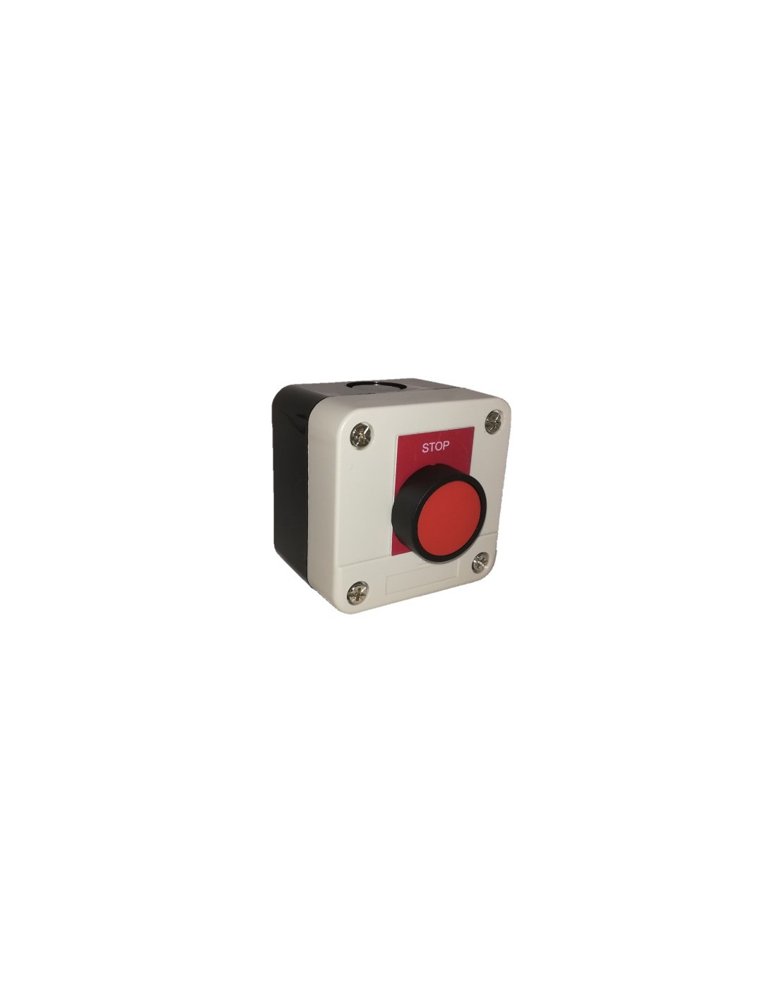 Stopped push button mounted with a red push button and label marked "STOP"